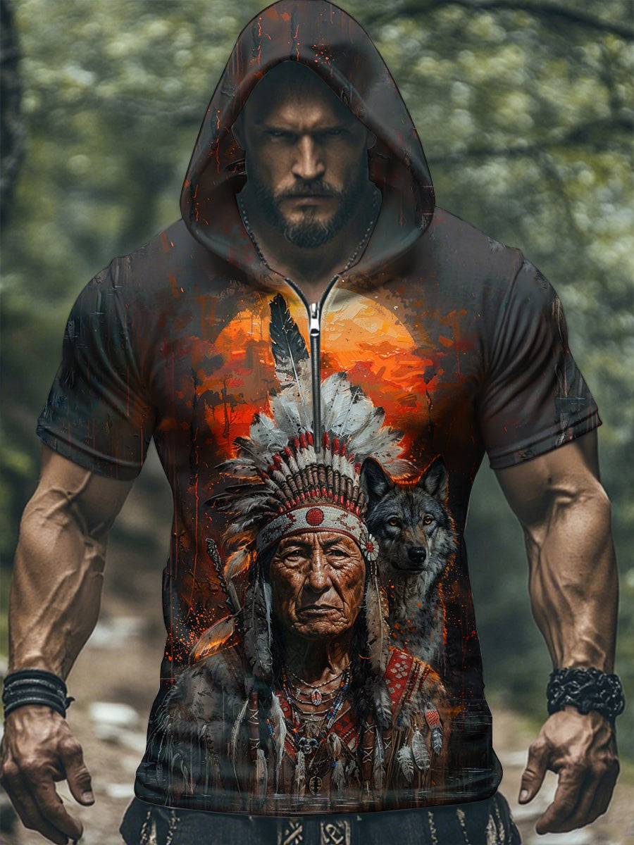 Men's Native American Wolf Hooded Short Sleeve T-Shirt