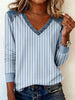 Women's Blue Striped Pattern Patchwork Art V-Neck Top