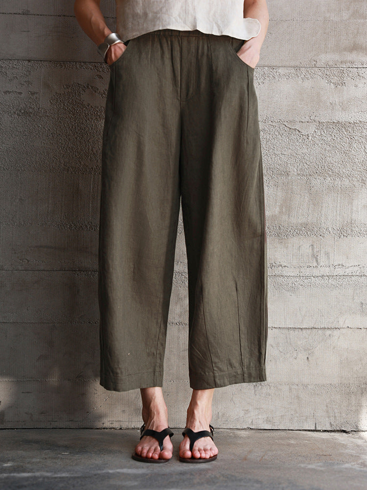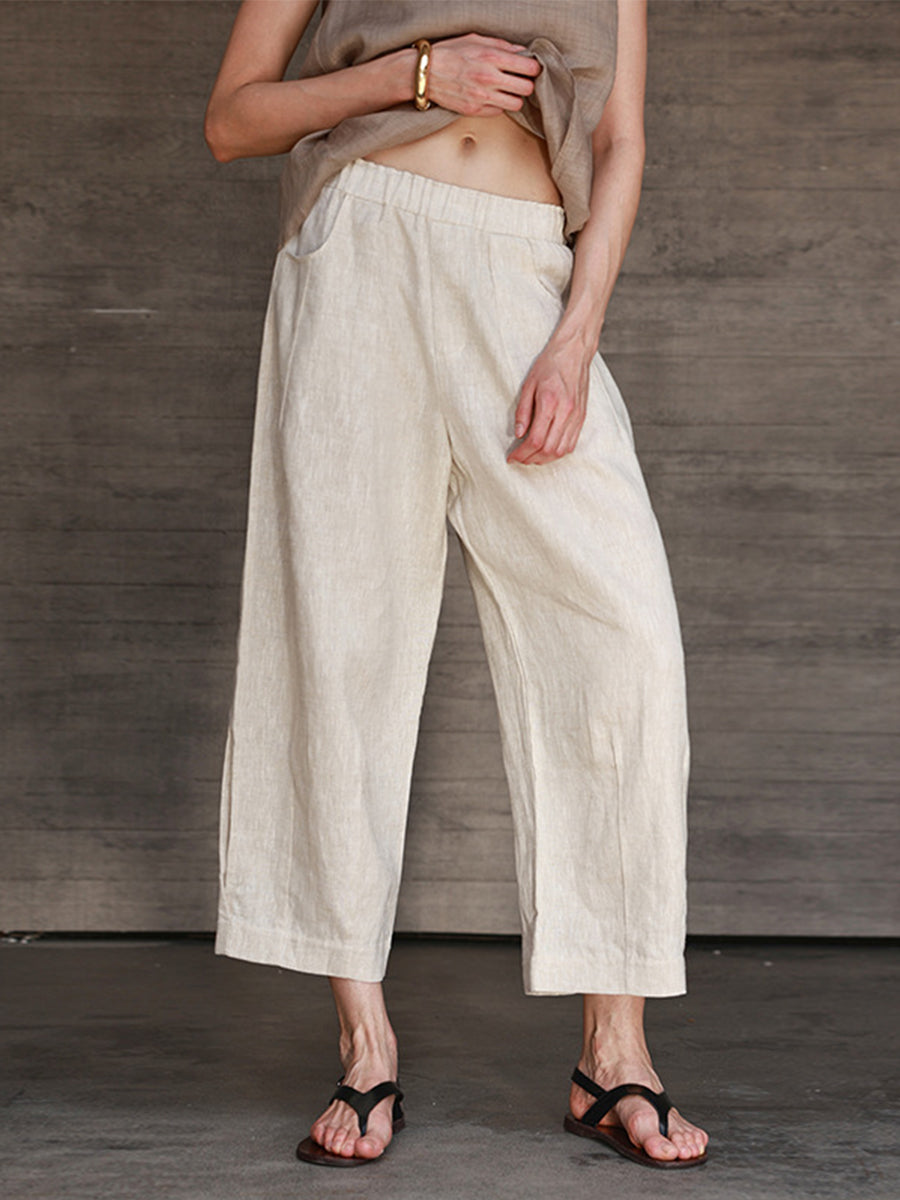 Women's Linen Elastic Waist All-match Straight Cropped Pants