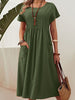 Women's Solid Color Round Neck Pocket Pleated Short Sleeve Cotton Linen Dress